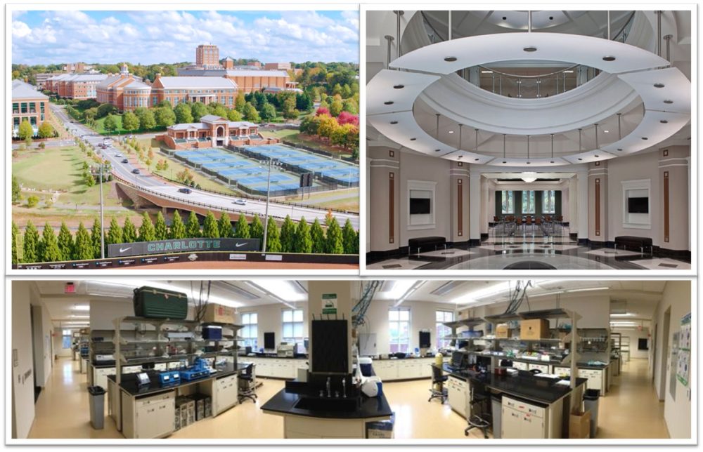 Alt text: Top left: Aerial view of the University of North Carolina at Charlotte campus with academic buildings, green spaces, and tennis courts in the foreground. Top right: Interior view of the EPIC building lobby with a circular ceiling design, polished floors, and a seating area. Bottom: Wide-angle view of the environmental engineering research laboratory with central bench workstations, analytical equipment, and shelves for instruments and supplies.