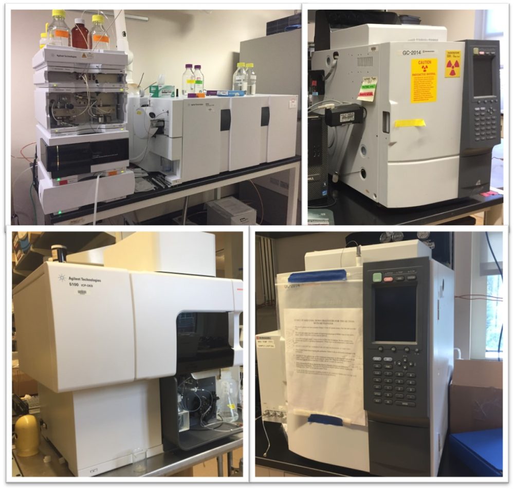 Alt text: Top left: Agilent 1100 liquid chromatography with 6410 triple quadrupole mass spectrometry. Top right: Shimadzu 2014 with electron capture detector and flame ionization detector. Bottom left: Agilent 5100 inductively coupled plasma-optical emission spectrometry. Bottom right: Shimadzu 2014 with flame ionization detector and thermal conductivity detector.
