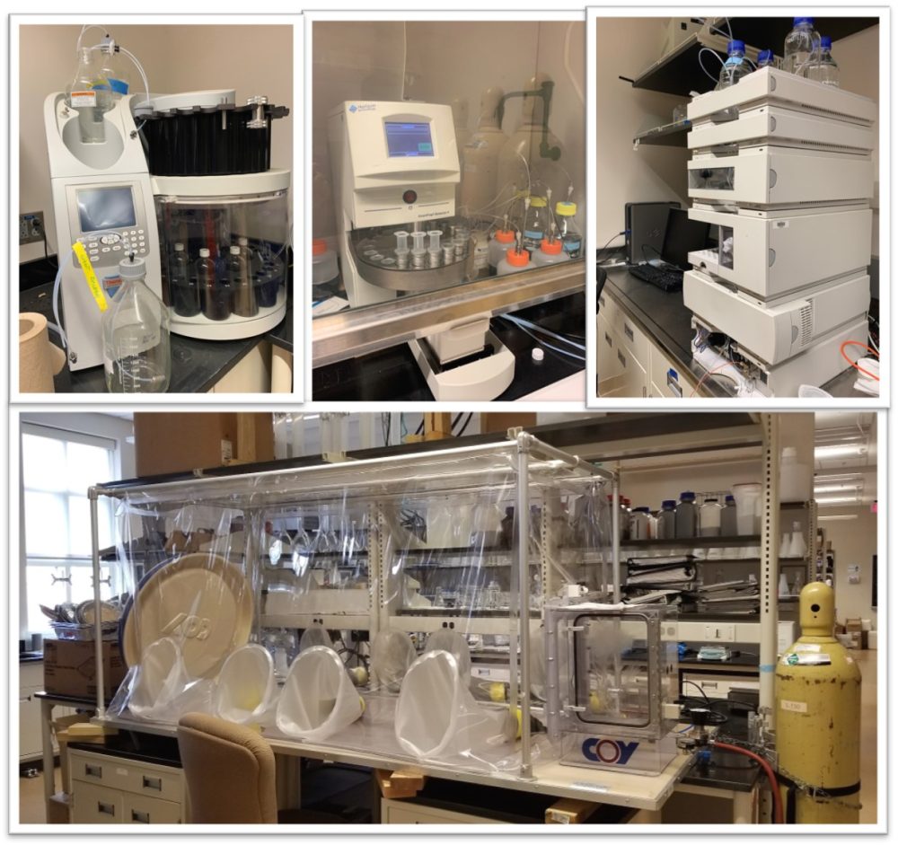 Alt text: Top left: Dionex ASE 350 Accelerated Solvent Extractor. Top middle: Biotage Horizon SmartPrep automated cartridge extractor. Top right: Agilent 1100 high-performance size exclusion chromatography with fluorescence spectroscopy and UV/Vis spectrophotometry. Bottom: Anaerobic glove box chamber on a lab bench for handling oxygen-sensitive samples, with gas cylinders and laboratory supplies in the background.